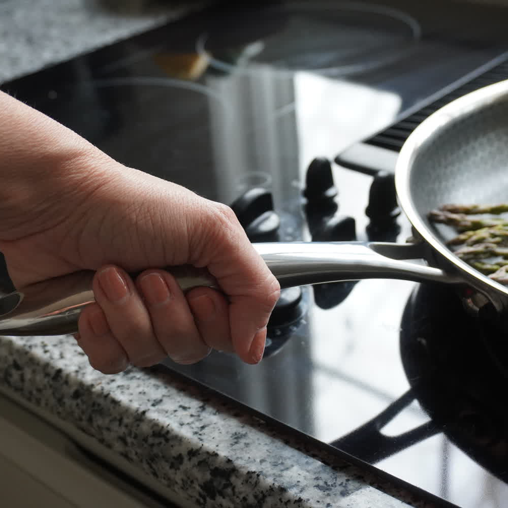 Our hybrid pan surface enhances flavor development by bonding with your food, similar to pure stainless steel pans. Releasing the bond is effortless—just cook with a small amount of oil or butter, and give your food a gentle nudge with a spatula. Experience the same flavors as with stainless steel but with a more glide-friendly surface.
