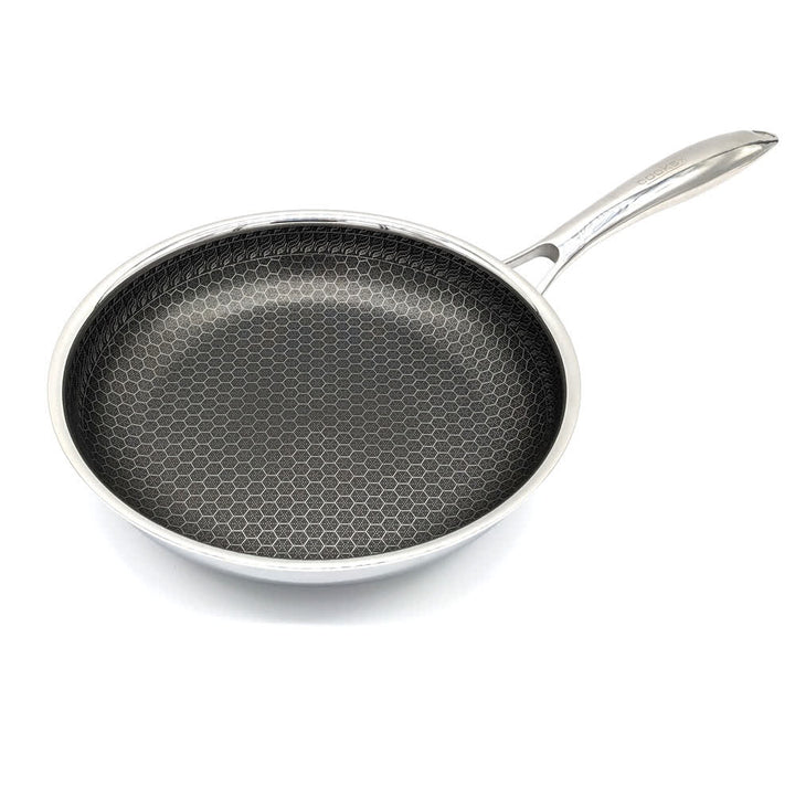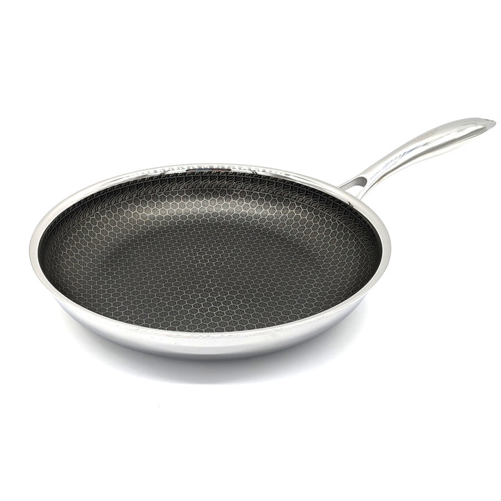 The perfect combination of nonstick and stainless steel. Hybrid technology allows metal utensils to glide on the stainless steel honeycomb ribs without scratching the ceramic nonstick coating.