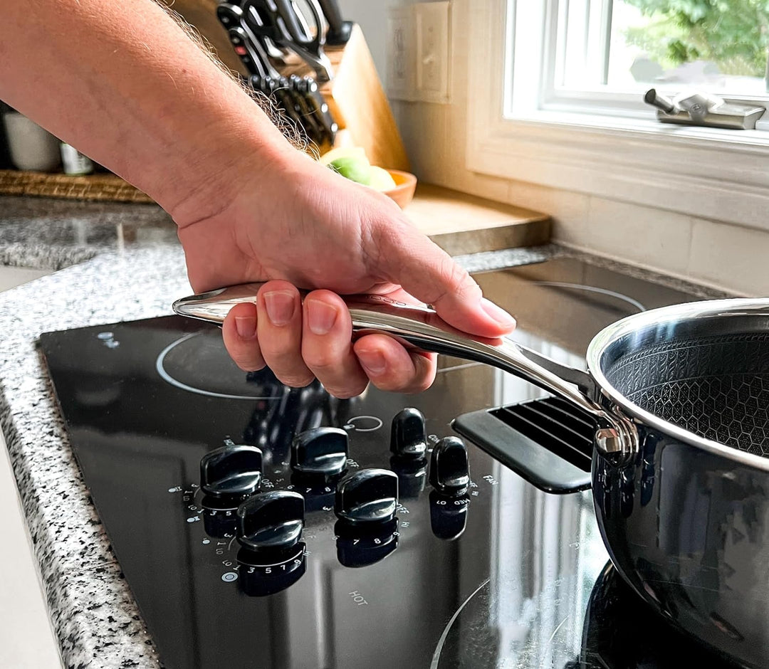 Cook confidently with our hybrid pan – its handle stays cool even when hot, offers a comfortable grip, and is oven-safe